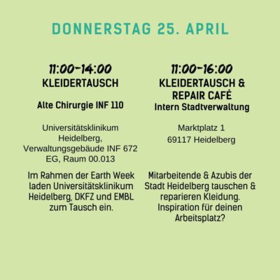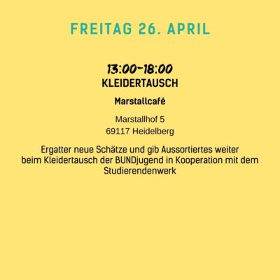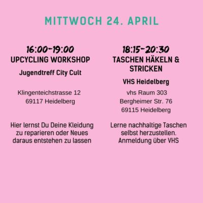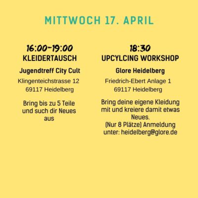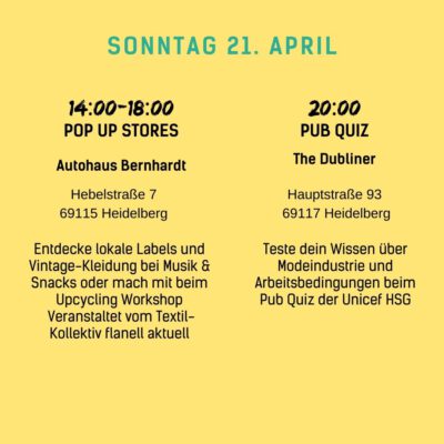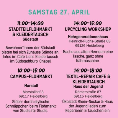 Auch wir werden mit vielen Kooperationspartnern vom 15.04. bis zum 28.04. mit Formaten wie Theaterstücken, Filmvorführungen, Ausstellungen oder Vorträgen Einblicke in diese Schattenseiten der Modewelt geben. Wir wollen aber nicht nur Missstände, sondern auch faire und nachhaltige Alternativen aufzeigen: zum Beispiel beim Flohmarkt, Kleidertausch-Parties, Fashion Shows, Repair- und DIY-Workshops oder einem Pop-Up-Markt mit fairen Labels.