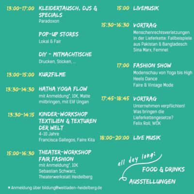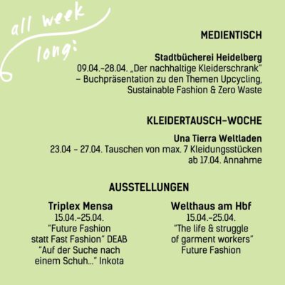 Zum vierten Mal veranstalten wir in Heidelberg die Fashion Revolution Week – eine Woche voller Aktionen und Events rund um die Themen Modemissstände und faire Mode.
