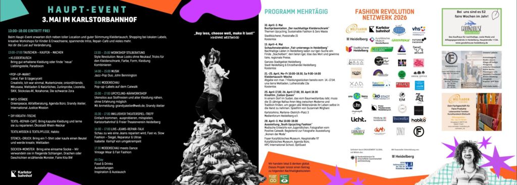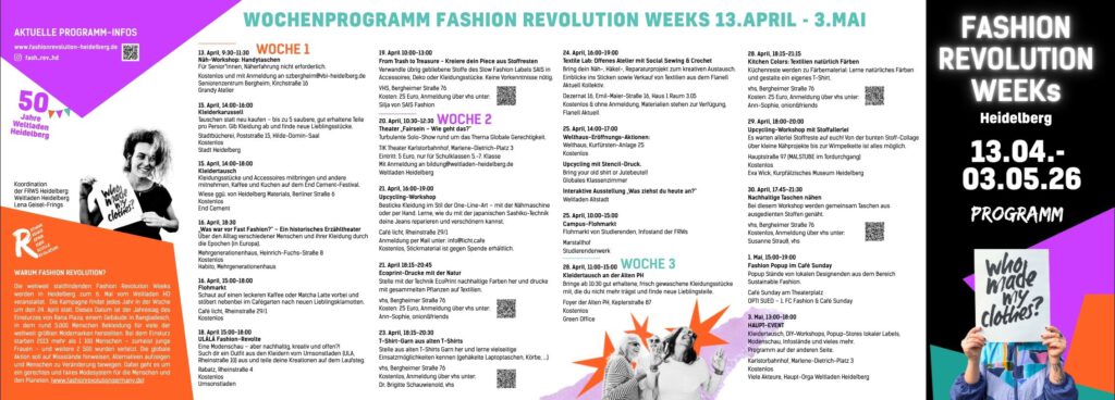 Zum 6. Mal holen wir die Fashion Revolution Weeks nach Heidelberg. Die Koordination liegt beim Weltladen Heidelberg. Beteiligt sind etwa 40 Akteure aus den verschiedensten Bereichen: Stadt Heidelberg, lokale Labels, Läden mit fairer oder 2nd Hand Mode, Vereine aus dem Bereich Nachhaltigkeit, Hochschulgruppen, Universität,…